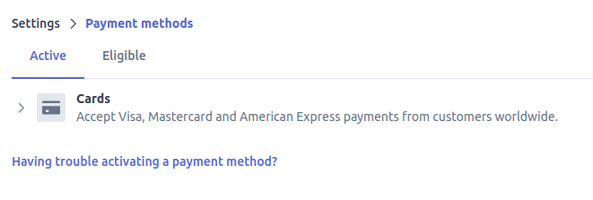 If your Stripe account has not used Apple Pay before you will need to select Eligible to see Apple Pay in the list.